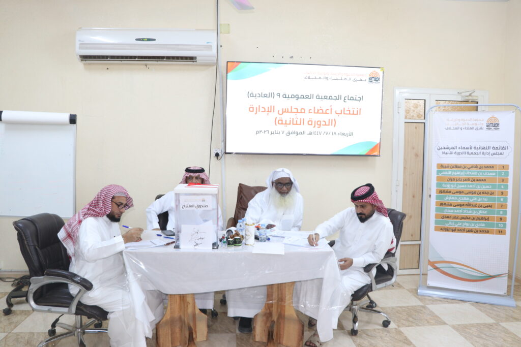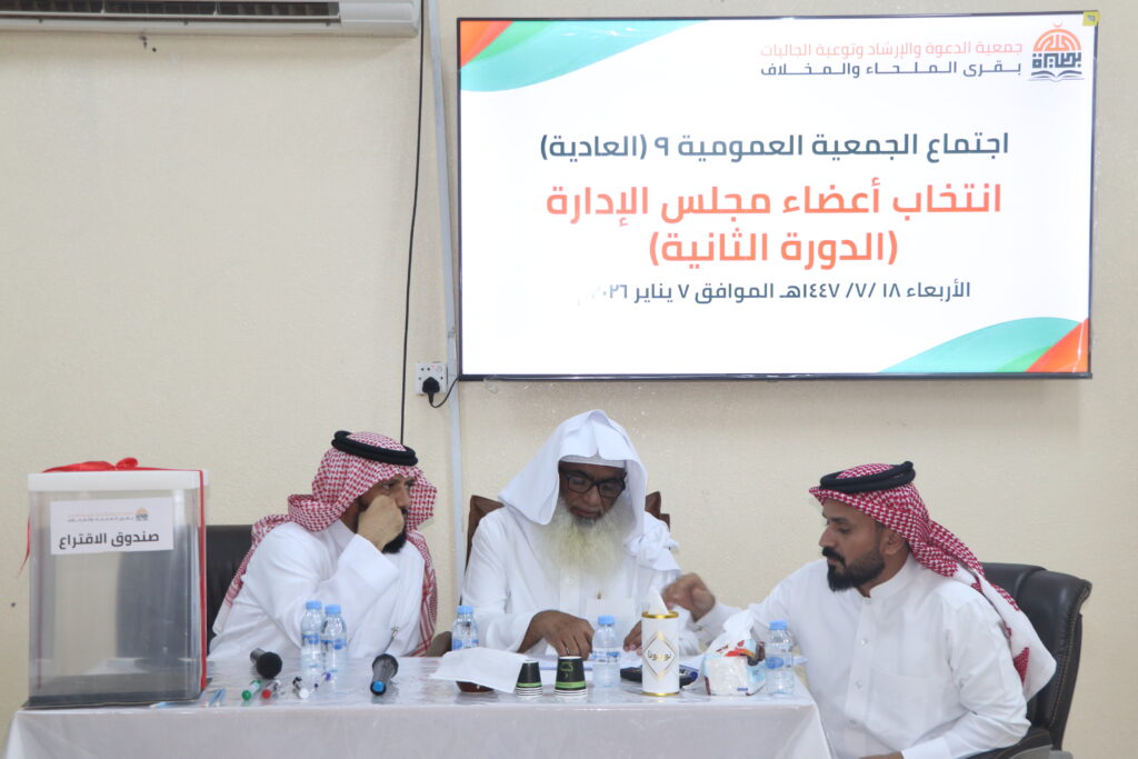 عقدت جمعية الدعوة والإرشاد وتوعية الجاليات بقرى الملحاء والمخلف، مساء يوم الأربعاء 18/ 7/ 1447هـ، الموافق 7/ 1 / 2026م، اجتماع الجمعية العمومية (العادية) التاسع، وذلك بمقر الجمعية، بحضور كامل أعضاء الجمعية.